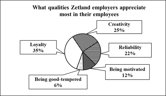 Imagine that you are doing a project on what qualities Zetland employers appreciate most in their employees. You have found some data on the subject – the results of the opinion polls (see the pie chart below) .