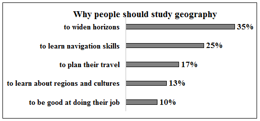 ; ; Imagine that you are doing a project onhow people stay healthyin Zetland. You have found some data on the subject–the results ofthe opinion polls (see the table below) .; Comment on thedata in the tableand give your opinion onthe subject of the project.; ; ; ; ; ; ; ; ; ; ; ; ; ; ; Write200–250 words.; ; Use the following plan:; –make an opening statement on the subject of the project;; –select and report 2–3 facts;; –make 1–2 comparisons where relevant;; –outline a problem that can arise withsome approaches to staying healthyand suggest a way of solving it;; –conclude by giving your opinion on the importance of staying healthy.; Imagine that you are doing a project onwhy people should study geographyin Zetland. You have found some data on the subject–the results of the opinion polls(see the diagram below) .; Comment on thedata in the diagram and give your opinion onthe subject of the project.; ; ; ; Write200–250 words.; ; Use the following plan:; –make an opening statement on the subject of the project;; –select and report 2–3facts;; –make1–2comparisons where relevant;; –outline a problem that can arise with learning geography and suggesta way of solving it;; –conclude by giving your opinion on the importance of studying geography in our life.