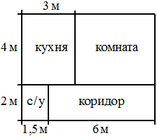 | Квартира состоит из комнаты, кухни, коридора и санузла (см. чертёж). Кухня имеет размеры , санузел , длина коридора 6 м. Найдите площадь комнаты (в квадратных метрах). |