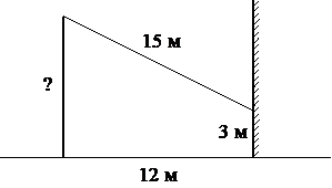 От столба к дому натянут провод длиной 15 м, который закреплён на стене дома на высоте 3 м от земли (см. рисунок). Найдите высоту столба, если расстояние от дома до столба равно 12 м. Ответ дайте в метрах.; ; ;
