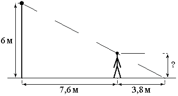 Человек стоит на расстоянии 7,6 м от столба, на котором висит фонарь, расположенный на высоте 6 м. Длина тени человека равна 3,8 м. Какого роста человек (в метрах)?