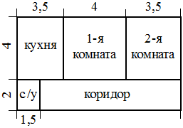 Квартира состоит из двух комнат, кухни, коридора и санузла (см. чертёж). Первая комната имеет размеры