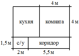 | Квартира состоит из комнаты, кухни, коридора и санузла (см. чертёж). Комната имеет размеры , санузел , длина коридора 5,5 м. Найдите площадь кухни (в квадратных метрах). |