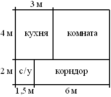 ; Квартира состоит из комнаты, кухни, коридораи санузла (см. чертёж). Кухня имеет размеры3м×4м, санузел—1,5м×2м, длинакоридора 6 м. Найдите площадь комнаты(в квадратных метрах).; ; ; ; ;