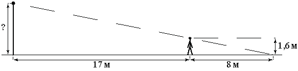Человек, рост которого равен 1,6 м, стоит на расстоянии 17 м от уличного фонаря. При этом длина тени человека равна 8 м. Определите высоту фонаря (в метрах).;