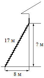 | Пожарную лестницу длиной 17 м приставили к окну дома. Нижний конец лестницы отстоит от стены на 8 м. На какой высоте находится верхний конец лестницы? Ответ дайте в метрах. |