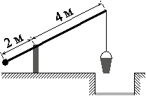 На рисунке изображён колодец с «журавлём». Короткое плечо имеет длину 2 м, а длинное плечо — 4 м. На сколько метров опустится конец длинного плеча, когда конец короткого поднимется на 0,5 м?; ;