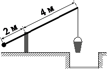 На рисунке изображён колодец с «журавлём». Короткое плечо имеет длину 2 м, а длинное плечо 4 м. На сколько метров опустится конец длинного плеча, когда конец короткого поднимется на 1,5 м?