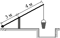На рисунке изображён колодец с «журавлём». Короткое плечо имеет длину 3 м, а длинное плечо — 4 м. На сколько метров опустится конец длинного плеча, когда конец короткого поднимется на 1,5 м?