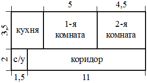 ; ; Квартира состоит из двух комнат, кухни, коридора и санузла (см. чертёж). Первая комната имеет размеры3,5м×5м, вторая—3,5м×4,5м, санузел имеет размеры2м×1,5м, длина коридора11м. Найдите площадь кухни(в квадратных метрах).; ;