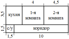 ; ; Квартира состоит из двух комнат, кухни, коридора и санузла (см. чертёж). Первая комната имеет размеры3,5м×4м, вторая—3,5м×4,5м, санузел имеетразмеры1,5м×1,5м, длина коридора10м.Найдите площадь кухни (в квадратных метрах).;