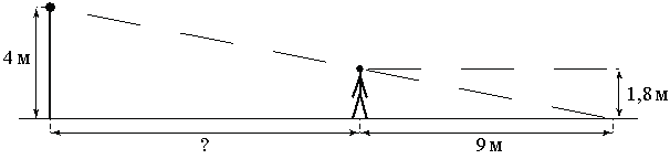 На каком расстоянии (в метрах) от фонаря стоит человек ростом 1,8 м, если длина его тени равна 9 м, высота фонаря 4 м?;