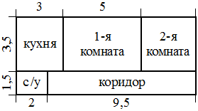 ; Квартира состоит из двух комнат,кухни, коридора и санузла (см. чертёж). Кухня имеет размеры3,5м×3м, первая комната—3,5м×5м, санузел имеетразмеры1,5м×2м, длина коридора9,5м.Найдите площадь второй комнаты(в квадратных метрах).
