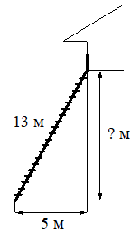| Пожарную лестницу длиной 13 м приставили к стене дома. Нижний конец лестницы отстоит от стены на 5 м. На какой высоте находится верхний конец лестницы? Ответ дайте в метрах. |