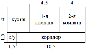 ; ; Квартира состоит из двух комнат, кухни, коридора и санузла (см. чертёж). Первая комната имеет размеры4м×4,5м, вторая—4м×4м, санузел имеет размеры1,5м×1,5м, длина коридора10,5м. Найдите площадь кухни (в квадратных метрах).; ;