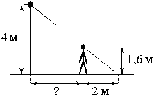 ; На каком расстоянии (в метрах) от фонаря стоит человек ростом 1,6 м, если длина его тени равна 2 м, высота фонаря 4 м?; ; ;