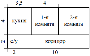 Квартира состоит из двух комнат, кухни, коридора и санузла (см. чертёж). Кухня имеет размеры