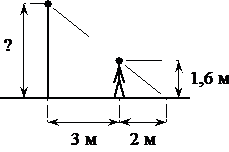 Человек, рост которого равен 1,6 м, стоит на расстоянии 3 м от уличного фонаря. При этом длина тени человека равна 2 м. Определите высоту фонаря (в метрах).;