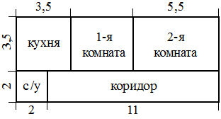 ; Квартира состоит из двух комнат, кухни, коридора и санузла(см. чертёж). Кухня имеет размеры3,5м×3,5м, вторая комната—3,5м×5,5м, санузел имеет размеры2м×2м, длина коридора11 м. Найдите площадь первой комнаты (в квадратных метрах).