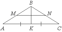 ; В равнобедренном треугольникеABCс основаниемACмедианаBK=20,отрезокMN, соединяющий середины боковых сторон, равен 21. Найдите боковую сторонуAB.;