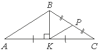 ; В равнобедренном треугольникеABCоснованиеAC=80, высотаBK, проведённая к основанию, равна 9. ТочкаP—середина стороныBC. Найдите длину отрезкаKP.;