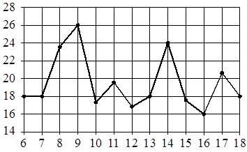 На рисунке жирными точками показана среднесуточная температура воздуха в Бресте каждый день с 6 по 18 июля 1981 года. По горизонтали указываются числа месяца, по вертикали — температура в градусах Цельсия.Для наглядности жирные точки соединены линиями.; ; ; ; Определите по рисунку наименьшую среднесуточную температуру в Брестев период с 7 по 17 июля включительно. Ответ дайте в градусах Цельсия.;