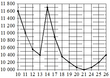 На рисунке жирными точками показана цена никеля на момент закрытия биржевых торгов во все рабочие дни с 10 по 26 ноября 2008 года.По горизонтали указаны числа месяца, по вертикали—цена никеляв долларах США за тонну. Для наглядности жирные точки на рисунке соединены линией.; ; ; ; Определите по рисунку наибольшую цену никеля на момент закрытия торгов в период с 11 по 19 ноября. Ответ дайте в долларах США за тонну.;