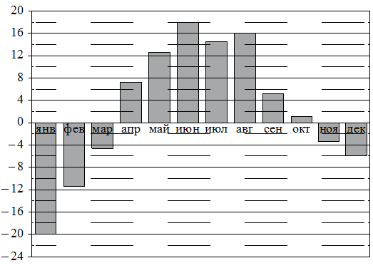 На диаграмме показана среднемесячная температура воздухав Екатеринбурге (Свердловске) за каждый месяц 1973 года. По горизонтали указаны месяцы, по вертикали—температура в градусах Цельсия.; ; ; ; Определите по диаграмме наименьшую среднемесячную температурув Екатеринбурге (Свердловске) в 1973 году. Ответ дайте в градусах Цельсия.;