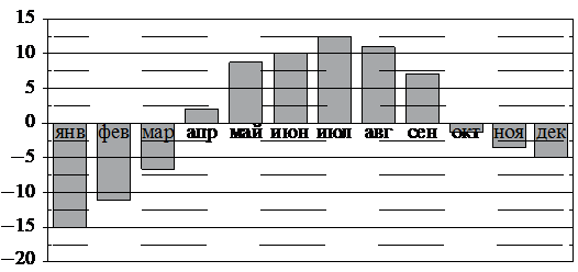 в Петрозаводске за каждый месяц 1976 года. По горизонтали указаны месяцы, по вертикали температура в градусах Цельсия.