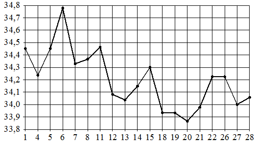 На рисунке жирными точками показан курс евро, установленный Центробанком РФ во все рабочие дни с 1 по 28 февраля 2003 года.По горизонтали указываются числа месяца, по вертикали—цена евров рублях. Для наглядности жирные точки на рисунке соединены линиями.; ; ; ; Определите по рисунку, какого числа курс евро был наименьшимза указанный период.;