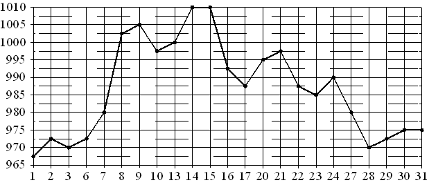 На рисунке жирными точками показана цена золота, установленная Центробанком РФ во все рабочие дни в октябре 2009 года. По горизонтали указываются числа месяца, по вертикали цена золота в рублях за грамм. Для наглядности жирные точки на рисунке соединены линиями.