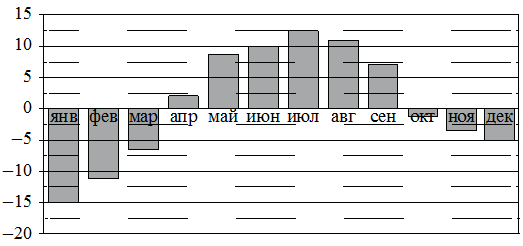 На диаграмме показана среднемесячная температура воздухав Петрозаводске за каждый месяц 1976 года. По горизонтали указаны месяцы, по вертикали—температура в градусах Цельсия.; ; ; ; Определите по диаграмме наименьшую среднемесячную температурув Петрозаводске в 1976 году. Ответ дайте в градусах Цельсия.;