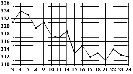 На рисунке жирными точками показана цена золота на момент закрытия биржевых торгов во все рабочие дни с 3 по 24 октября 2002 года.По горизонтали указаны числа месяца, по вертикали—цена золотав долларах США за унцию. Для наглядности жирные точки на рисунке соединены линиями.; ; ; ; ; ; Определите по рисунку, какого числа цена золота на момент закрытия торгов была наибольшей за данный период.;