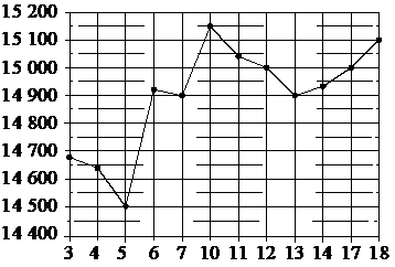 На рисунке жирными точками показана цена олова на момент закрытия биржевых торгов во все рабочие дни с 3 по 18 сентября 2007 года.По горизонтали указаны числа месяца, по вертикали—цена оловав долларах США за тонну. Для наглядности жирные точки на рисунке соединены линиями.; ; ; ; Определите по рисунку наименьшую цену олова на момент закрытия торгов за данный период. Ответ дайте в долларах США за тонну.;