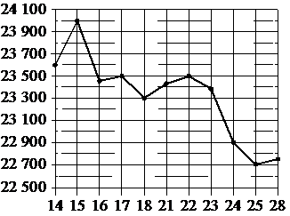 На рисунке жирными точками показана цена олова на момент закрытия биржевых торгов во все рабочие дни с 14 по 28 июля 2008 года.По горизонтали указаны числа месяца, по вертикали—цена оловав долларах США за тонну. Для наглядности жирные точки на рисунке соединены линиями.; ; ; ; ; Определите по рисунку, какого числа цена олова на момент закрытия торгов была наибольшей за данный период.;