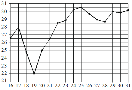 На рисунке жирными точками показана среднесуточная температура воздуха в Нижнем Новгороде каждый день с 16 по 31 июля 2010 года.По горизонтали указаны числа месяца, по вертикали—температурав градусах Цельсия. Для наглядности жирные точки на рисунке соединены линиями.; ; ; ; Определите по рисунку наименьшую среднесуточную температуру в Нижнем Новгороде за данный период. Ответ дайте в градусах Цельсия.;