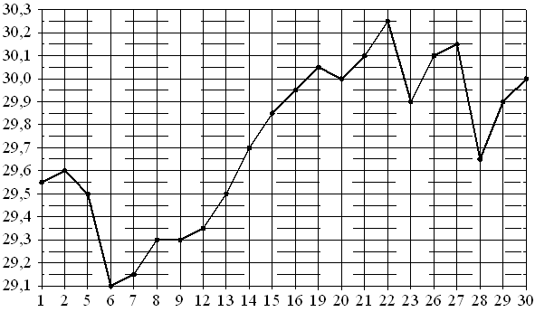 На рисунке жирными точками показан курс австралийского доллара, установленный Центробанком РФ во все рабочие дни в октябре 2010 года.По горизонтали указываются числа месяца, по вертикали—ценаавстралийского доллара в рублях. Для наглядности жирные точки на рисунке соединены линиями. Определите по рисунку наибольший курс австралийского доллара за данный период. Ответ дайте в рублях.; ;