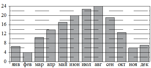На диаграмме показана среднемесячная температура воздуха в Сочиза каждый месяц 1920 года. По горизонтали указываются месяцы,по вертикали—температура в градусах Цельсия.; ; ; ; Определите по диаграмме наименьшую среднемесячную температуруво второй половине 1920 года. Ответ дайте в градусах Цельсия.;