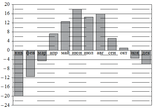 На диаграмме показана среднемесячная температура воздухав Екатеринбурге (Свердловске) за каждый месяц 1973 года. По горизонтали указываются месяцы, по вертикали — температура в градусах Цельсия.; ; ; ; Определите по диаграмме наименьшую среднемесячную температурув Екатеринбурге (Свердловске) в 1973 году. Ответ дайте в градусах Цельсия.;