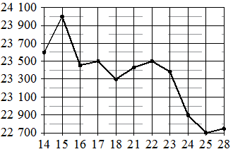 На рисунке жирными точками показана цена олова на момент закрытия биржевых торгов во все рабочие дни с 14 по 28 июля 2008 года.По горизонтали указываются числа месяца, по вертикали—цена оловав долларах США за тонну. Для наглядности жирные точки на рисунке соединены линиями.; ; ; ; Определите по рисунку наименьшую цену олова на момент закрытия торгов за данный период. Ответ дайте в долларах США за тонну.;
