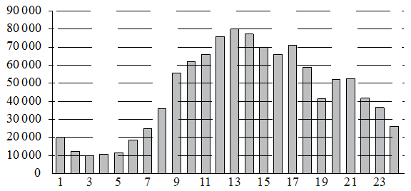 На диаграмме показано количество посетителей сайта РИА «Новости»в течение каждого часа 8 декабря 2009 года. По горизонтали указывается время (в часах), по вертикали—количество посетителей сайтана протяжении этого часа.; ; ; ; Определите по диаграмме, в течение какого часа на сайте РИА«Новости»побывало максимальное количество посетителей.