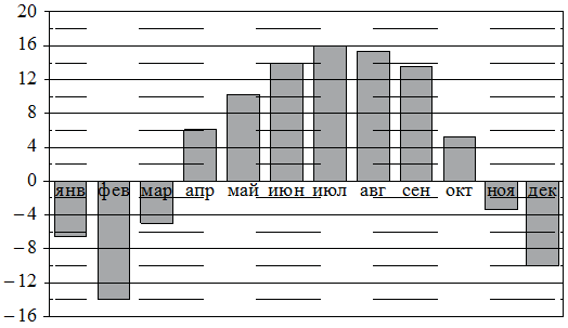 На диаграмме показана среднемесячная температура воздуха в Нижнем Новгороде за каждый месяц 1994 года. По горизонтали указываются месяцы, по вертикали — температура в градусах Цельсия.