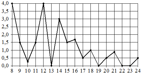 На рисунке жирными точками показано суточное количество осадков, выпадавших в Томске с 8 по 24 января 2005 года. По горизонтали указаны числа месяца, по вертикали—количество осадков, выпавших в соответствующий день, в миллиметрах. Для наглядности жирные точкина рисунке соединены линиями.; ; ; ; Определите по рисунку, какого числа в Томске впервые за данный период выпало ровно 1,5 миллиметра осадков.