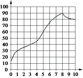 На графике показано изменение температуры в процессе разогрева двигателя легкового автомобиля. На горизонтальной оси отмечено время в минутах, прошедшее с момента запуска двигателя, на вертикальной оси температура двигателя в градусах Цельсия.