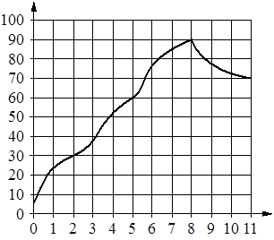 На графике изображена зависимость температуры от времени в процессе разогрева двигателя легкового автомобиля при температуре окружающего воздуха. На горизонтальной оси отмечено время в минутах, прошедшее с момента запуска двигателя, на вертикальной оси — температура двигателя в градусах Цельсия. Когда температура достигает определённого значения, включается вентилятор, охлаждающий двигатель, и температура начинает понижаться.; ; Определите по графику, сколько минут прошло с момента запуска двигателя до включения вентилятора.