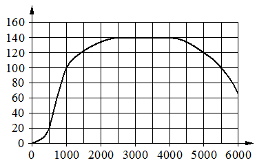 На графике показана зависимость крутящего момента автомобильного двигателя от числа оборотов в минуту. На горизонтальной оси отмечено число оборотов в минуту, на вертикальной оси крутящий момент в . Чтобы автомобиль начал движение, крутящий момент должен быть