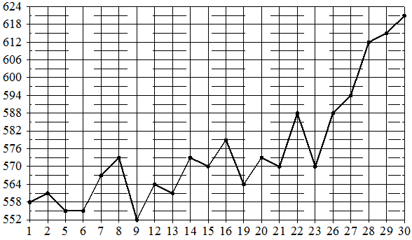 На рисунке жирными точками показана цена палладия, установленная Центробанком РФ во все рабочие дни в октябре 2010 года. По горизонтали указываются числа месяца, по вертикали — цена палладия в рублях за грамм. Для наглядности жирные точки на рисунке соединены линией.