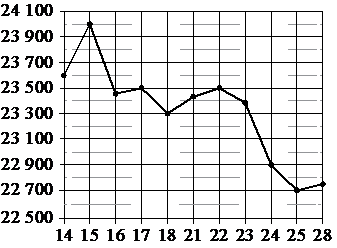 На рисунке жирными точками показана цена олова на момент закрытия биржевых торгов во все рабочие дни с 14 по 28 июля 2008 года.По горизонтали указаны числа месяца, по вертикали—цена оловав долларах США за тонну. Для наглядности жирные точки на рисунке соединены линиями.; ; ; ; Определите по рисунку наименьшую цену олова на момент закрытия торгов за данный период. Ответ дайте в долларах США за тонну.;