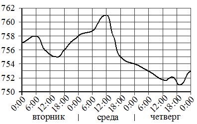 На рисунке показано изменение атмосферного давления в течение трёх суток. По горизонтали указаны дни недели и время, по вертикали значения атмосферного давления в миллиметрах ртутного столба.