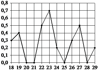 На рисунке жирными точками показано суточное количество осадков, выпавших в Якутске с 18 по 29 октября 1986 года. По горизонтали указываются числа месяца, по вертикали количество осадков, выпавших